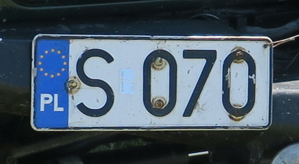 Left of the plate is a blue euroband with the oval PL, in white, below the twelve golden European stars.
