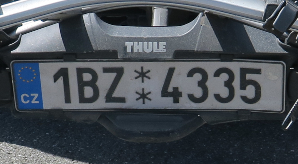 Left of the registration is a blue band with the oval CZ below the twelve golden European stars.